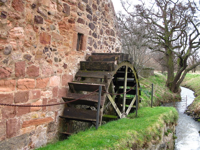 East Linton, Preston Mill  water wheel. The mill was extensively renovated in 1760 and is still functional. It is now run by the National Trust for Scotland. George RENNIE farmed nearby at Phantassie Farm.